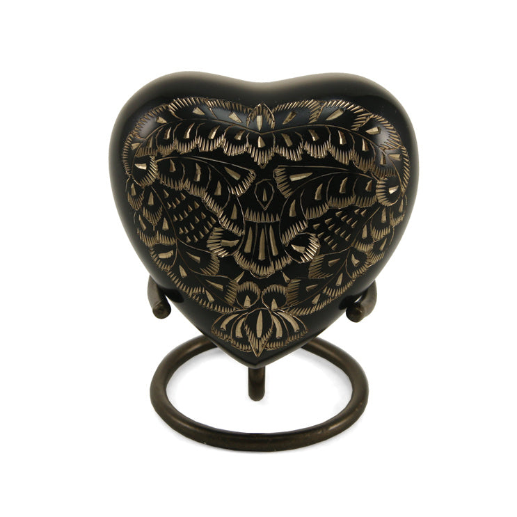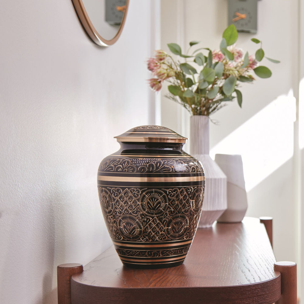 Let your loved one’s memory be a shining light with this brass cremation urn from our Elite Radiance Collection. Featuring a bold black finish, this full size piece is engraved by hand to showcase beautiful brass highlights in an ornate design.